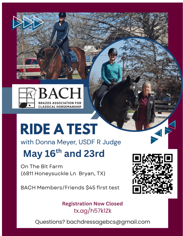 The Brazos Association for Classical Horsemanship (BACH) is a Group Member Organization (GMO) of the United States Dressage Federation in Region Nine. Founded in 1985, BACH has been supporting the horse community in the Brazos Valley for over 40 years.