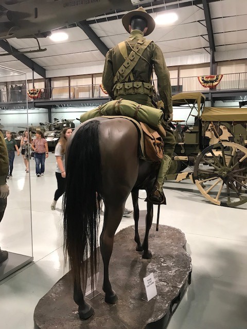 We enjoyed climbing into old military trucks, seeing the suspended helicopter, huge tanks, and a restored World War I tank. There is an enormous variety of printed matter, photos, medals, flags, etc., too much to see in one visit but well worth it. Yes, there was a horse connection–a model horse and rider from World War I, but don’t touch his tail!