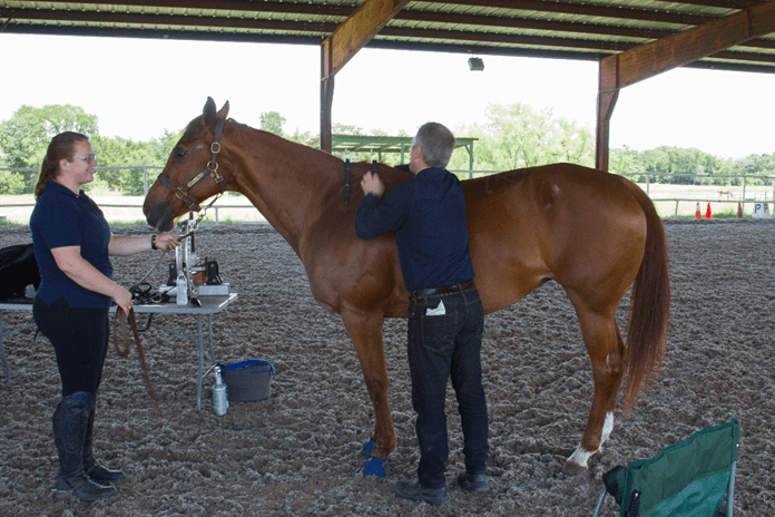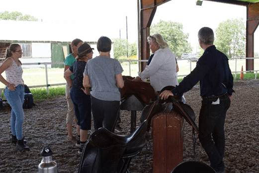 Thirteen people brought their lawn chairs and attended the saddle fitting lecture put on by Schleese Saddlery under the manicured and very cool, breezy covered arena at Topsider Farms. A big thanks to Schleese who are headquartered in Ontario, Topsider Farms owned by McKenzie Mull and Michelle Voorhees who was managing that day. Also to Charlie Sokolov, a Schleese Client Services Manager, and her mare Rosie who patiently permitted to be used as a demonstration horse.
