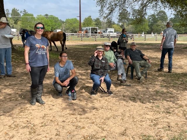 Scenes from New Horizons show March 12, 2023. BACH members show up in force. The spectators: Jenny, Kelly, Marcetta, Larry and Don. The riders: Aynsleigh on Ian, Emily on Ears, Jinny with Flash, Sarah.