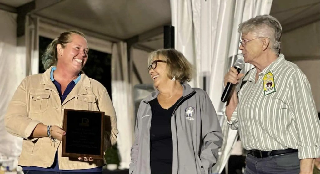 October, 2023. Past BACH president and local trainer/breeder Sarah Denham merits the Dressage Foundation Region 9 Teaching Excellence Award for 2023.