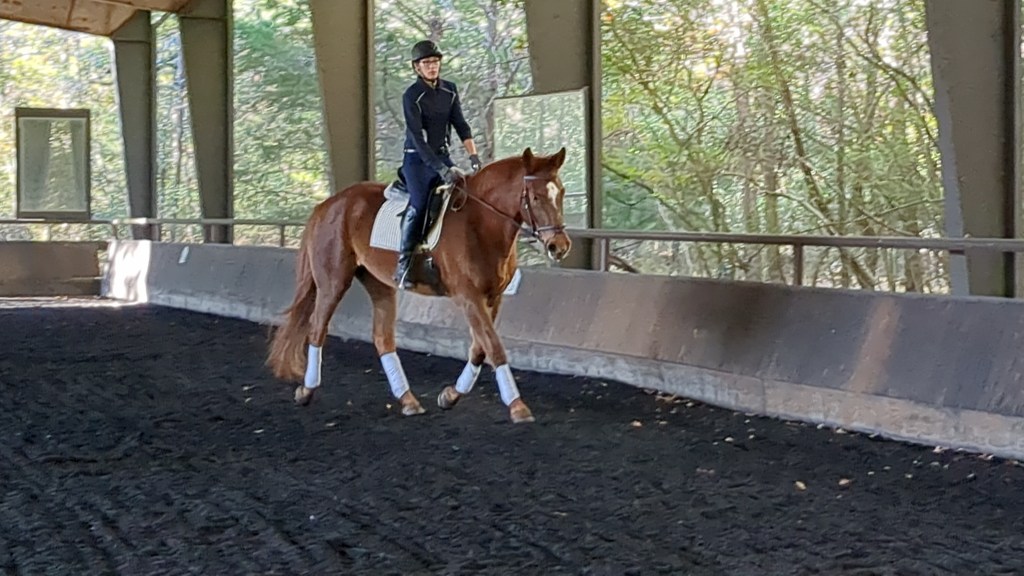 Hans Biss clinic at Look Sharp Farm. Left: Kelly riding Marcetta’s Gwen. Both horse and rider have the same birth year! Gwen still has her (very correct) flying changes.