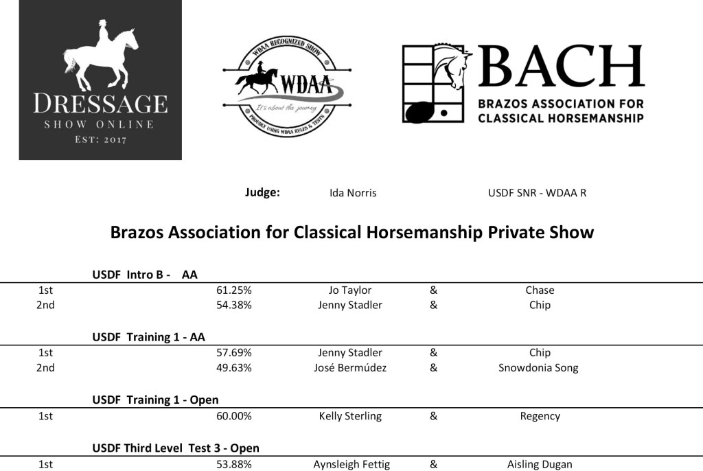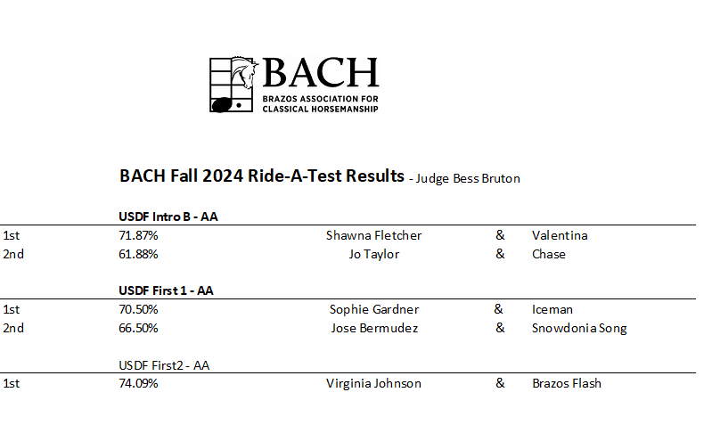 Congratulations to those that participated in the BACH Fall Virtual Show. Results are below.