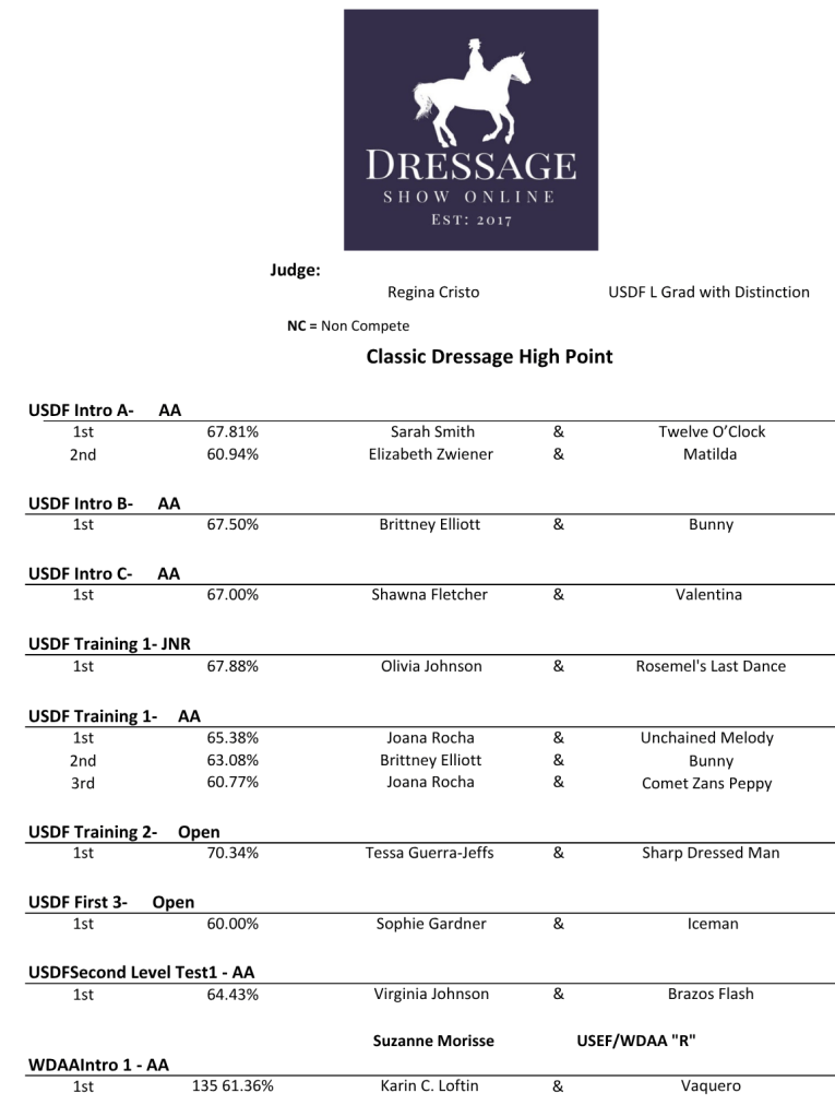 The weather was wonderful as were the horses. Thanks so much to Bess Bruton our L judge and Mary Wicksten, our scribe. Also a thank you to Donna and Rob Meyer at On-the-Bit Farm for all the preparation of the facilities. Results are below.